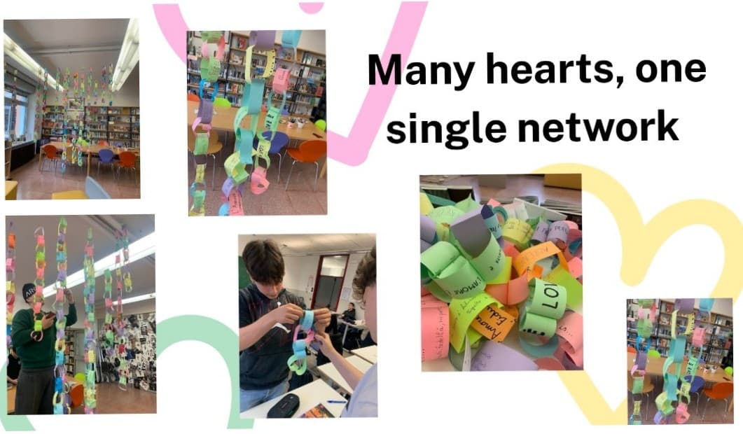 L’iniziativa, organizzata dal gruppo biblioteca per tutte le classi dell’istituto, ha coinvolto studenti, insegnanti e tutta la comunità scolastica in un’attività tanto semplice quanto significativa. A ciascuno è stato chiesto di scrivere su due striscioline colorate la frase “L’amore è…”con la propria personale definizione di amore. Ne sono nate parole profonde, sincere e a volte sorprendenti, capaci di raccontare il modo in cui i ragazzi ma anche gli adulti vivono e interpretano uno dei sentimenti più importanti della vita.
